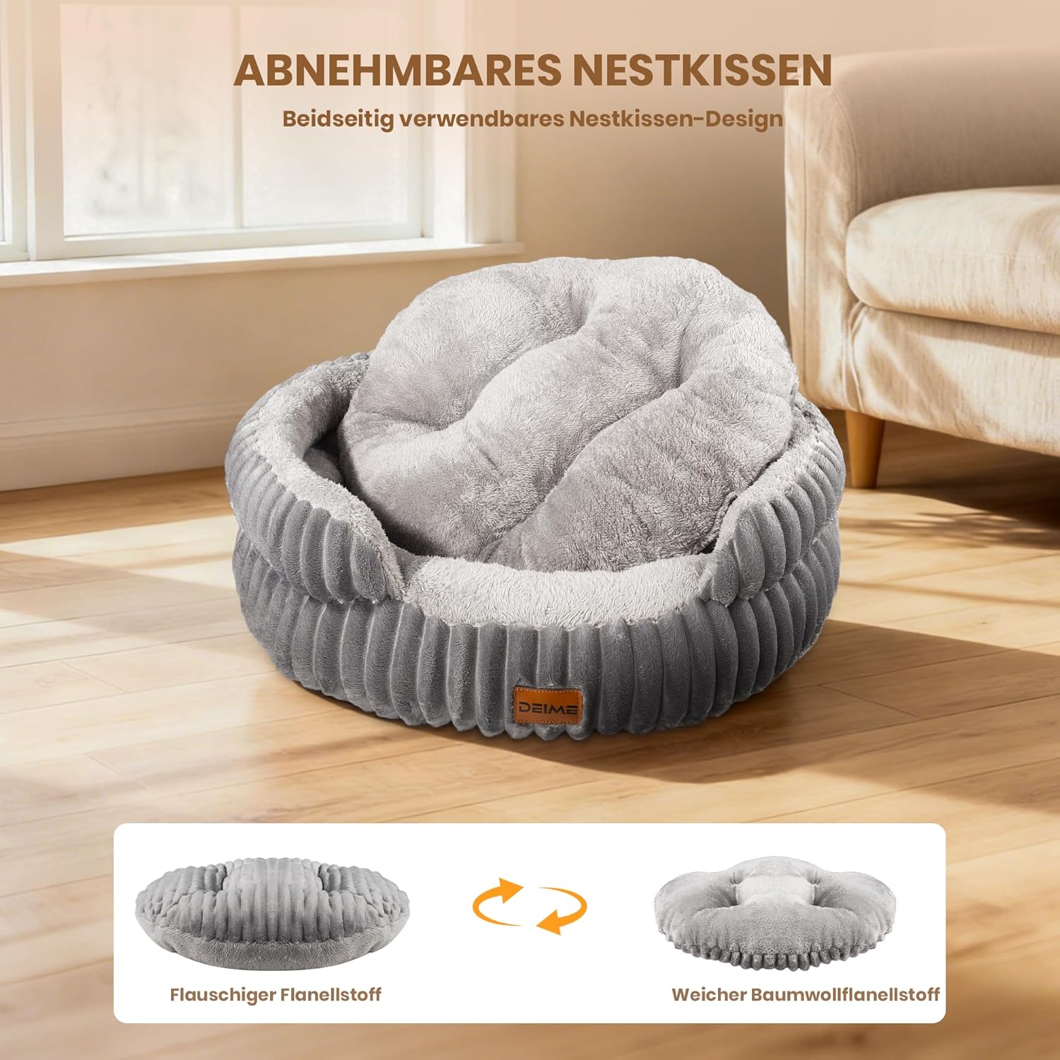 Ultra soft sleeping fabric: Our large dog bed has a cover made of ultra-soft flannel and plush cotton velour, which offers maximum comfort and breathability. Materials are resistant to chewing, scratching and other damage and ensure exceptional longevity even for active or playful dogs. The removable pad can be turned over and used on both sides. Create a soft, cozy sleeping place for your pet.
