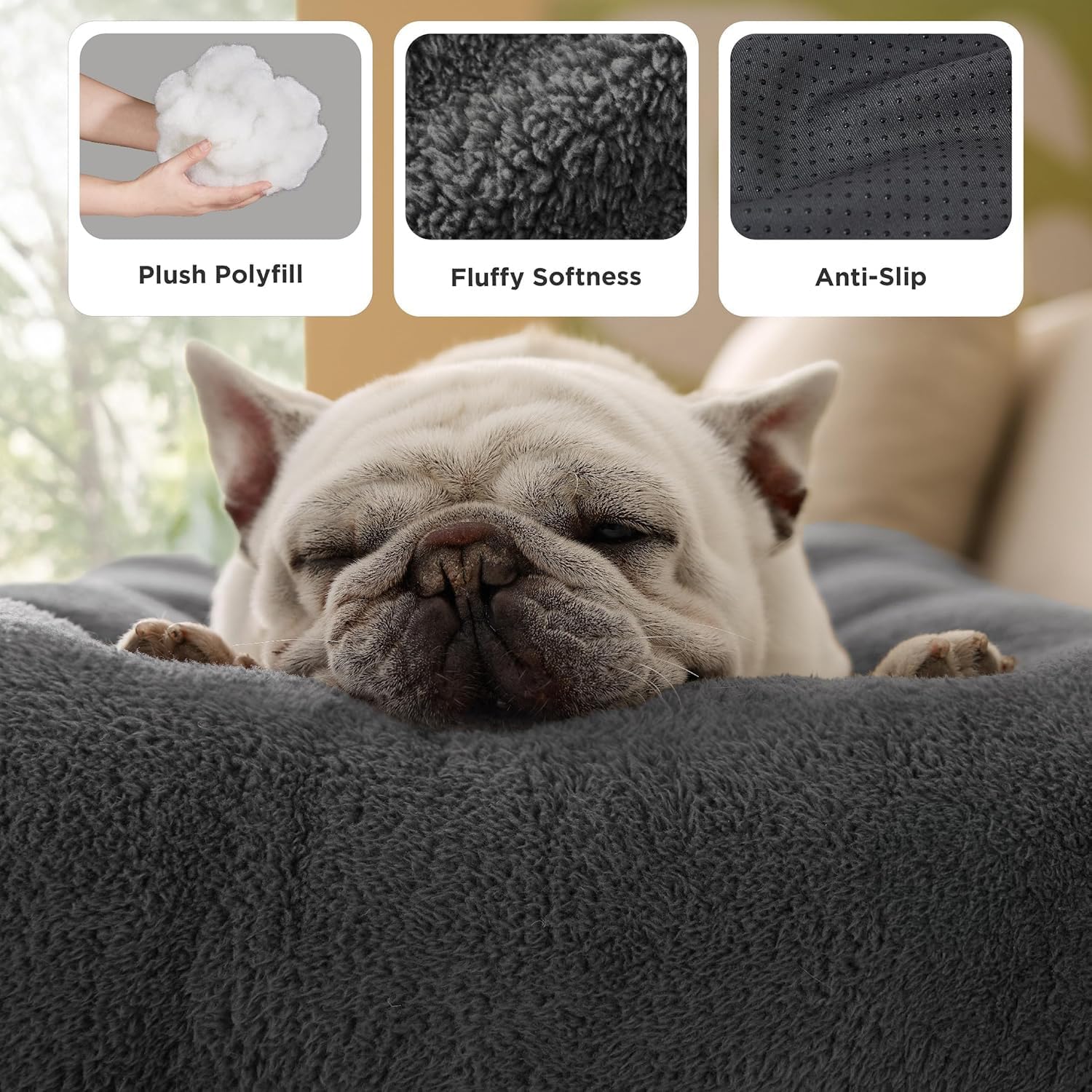 Non-slip base: stability and safety guaranteed! The non-slip base of the fluffy cat and dog beds is made of hundreds of silicone dots that prevent slipping. This keeps the bed firmly in place and creates a safe environment for relaxation and play.